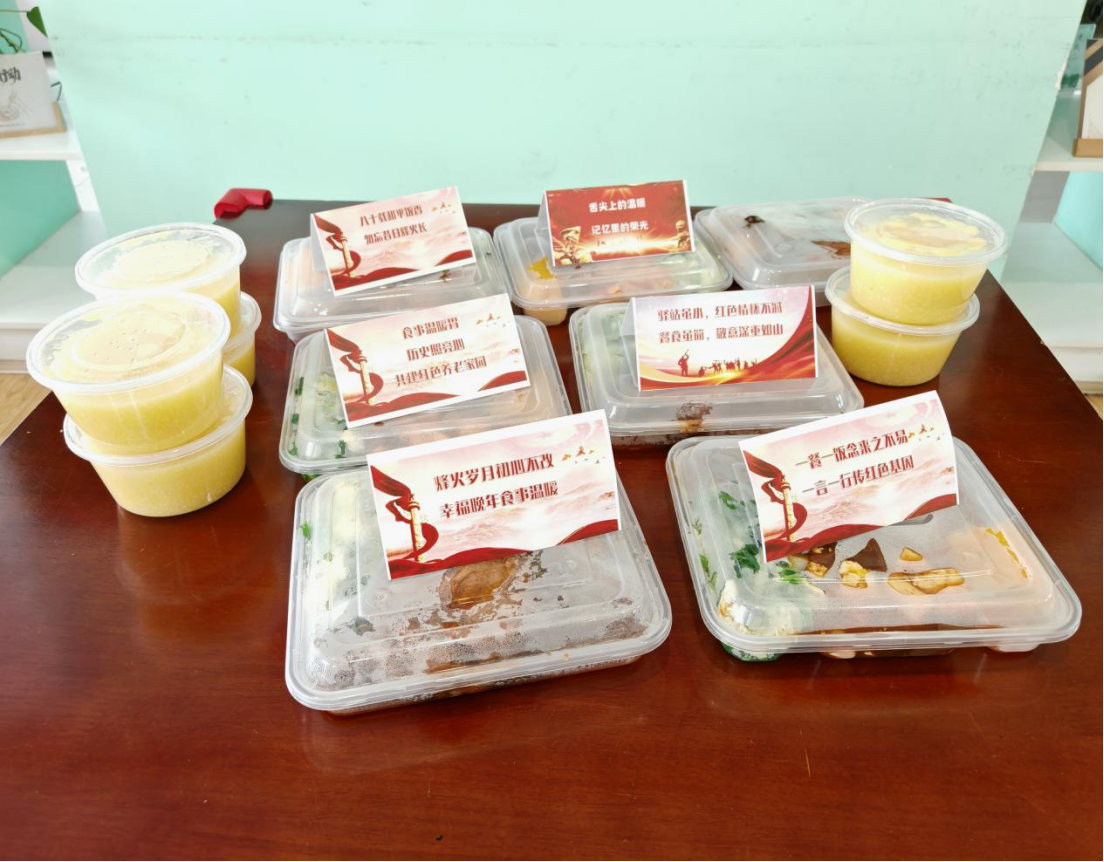 餐食设计:在餐盒中附上了抗战主题的纪念卡片或小贴纸,印有老兵故事、抗战历史知识点等内容,让老年人在用餐时感受红色氛围。